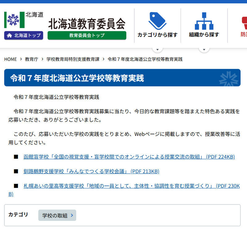【R7.12.23(火)更新】 北海道教育委員会は、今日的な教育諸課題への対応に関する特色ある優れた実践を募集し、応募のあった学校の実践をとりまとめ、Webページに掲載しています。 特別支援学校では、函館盲学校、釧路鶴野支援学校、札幌あいの里高等支援学校の3校の実践が掲載されています。 詳しくは、こちら(クリックすると、特別支援教育課のWebページへとびます)からご覧ください。 |