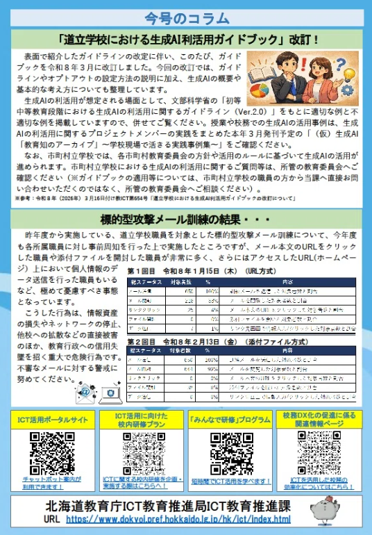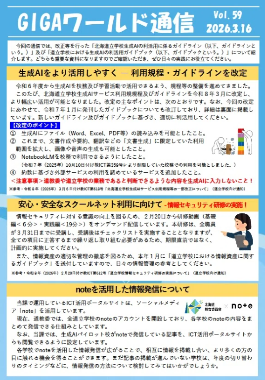 【R8.4.16(木)更新】 北海道教育委員会では、学校におけるICT活用を支援する取組として、ICTに関する情報を集めた広報誌「GIGAワールド通信」を発行しています。 第59号では、「生成AIの利活用に係るガイドラインの改定」や「生成AIの利活用ガイドブックの改訂」、「攻撃型訓練メールの実施」等について掲載しています。 詳しくは、こちらからご覧ください。