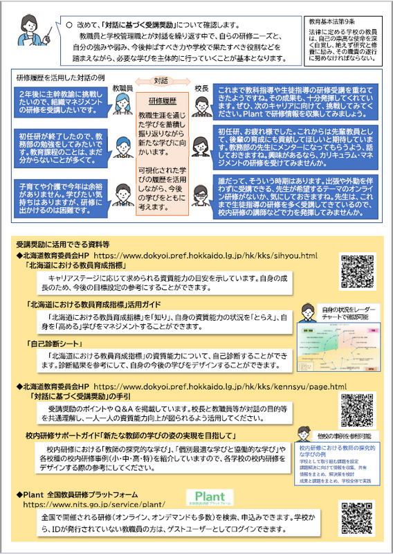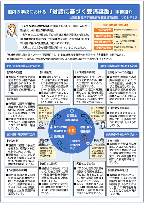 このリーフレットでは、道内の多くの学校管理職から回答いただいた「受講奨励における工夫や効果があった取組」から、事例を「期首・期末面談における対話」や「日常的な教師の学びに関する対話」など4つのカテゴリに分けて紹介されています。
