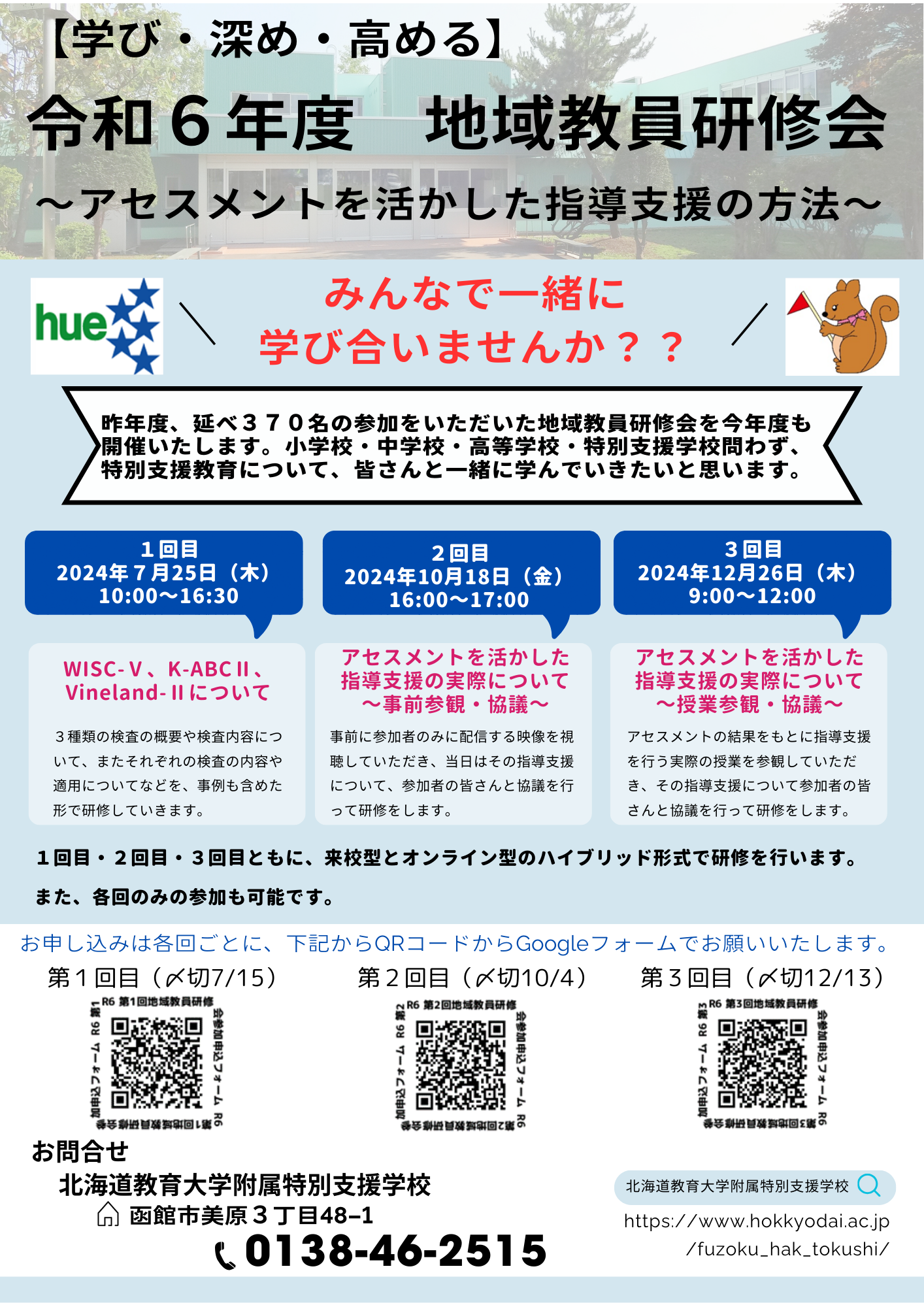 北海道教育大学附属特別支援学校では、小学校、中学校、高等学校及び特別支援学校の教職員を対象に「【学び・深め・高める】令和6年度 地域教員研修会」を開催します。