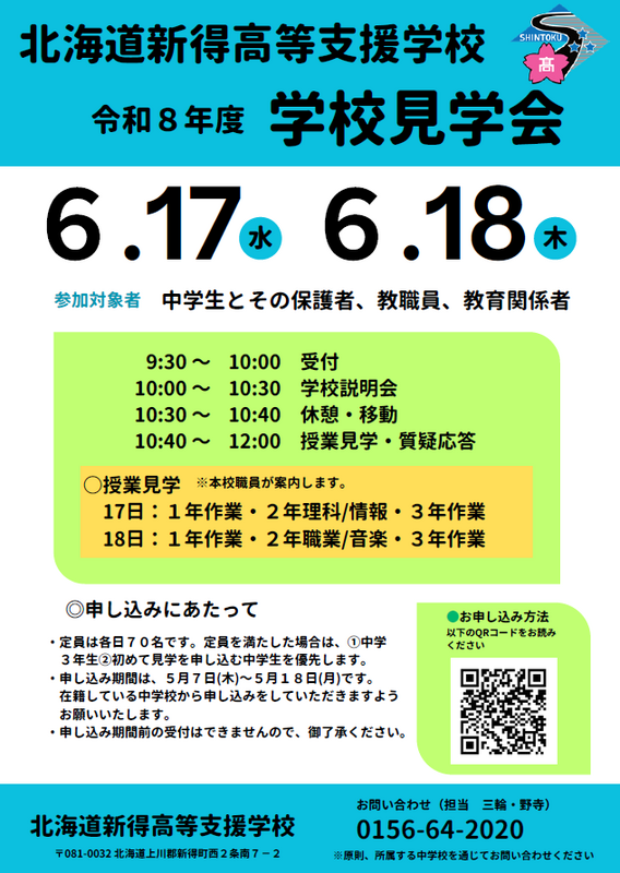 見学会の詳しい内容や申込方法は、新得高等支援学校のWebページ(←クリックすると、新得高等支援学校のWebページが開きます。)からご確認ください。 なお、本見学会の申込期間は、令和8年5月7日(木)~5月18日(月)となっています。 |