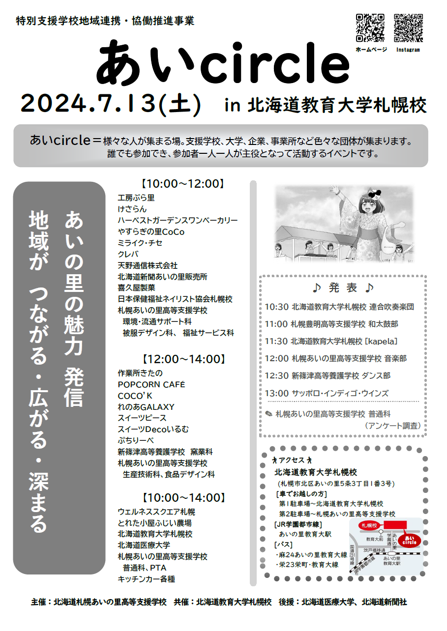 北海道札幌あいの里高等支援学校では、令和6年度第1回「あいcircle」を北海道教育大学札幌校にて開催します。