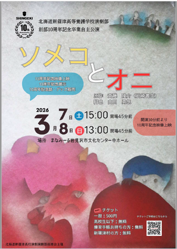 上演するのは、今年度の高文連石狩支部大会で優秀賞を受賞した斉藤隆介原作の「ソメコとオニ」で、その他にも10周年記念展示や10年を振り返る映像の上映などを予定しております。