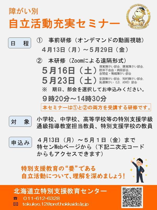 特センでは、令和8年度(2026年度)障がい別自立活動充実セミナーの申込みを受付中です。各障がいにおける実態把握や障がいの状態に応じた自立活動の指導等について、部会を選択して学ぶことができます。