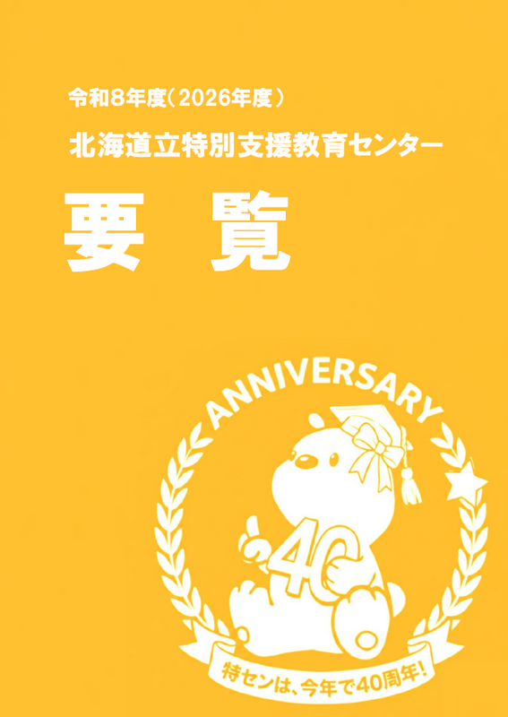 一覧へ 1. 令和8年度(2026年度)要覧について 投稿日時: 04/02 特セン 【R8.4.3(金)更新】 令和8年度(2026年度)の要覧をトップページに掲載しました。 令和8年度の特センの運営方針や主な事業等が掲載されています。 詳しくは、こちらからダウンロードしてご覧ください。(クリックすると、PDFファイルがダウンロードされます。) (画像をクリックすると、PDFファイルがダウンロードされます。)