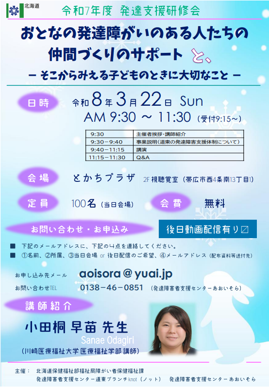【R8.2.3(火)更新】 北海道では、発達の遅れや障がいのある子ども、家族への支援の充実に関する施策の一つとして子どもの発達支援に関わる職員の資質向上及び地域の発達支援体制の充実を図ることを目的として、発達支援研修会を開催しています。 今年度は、令和8年3月22日(日)に、帯広市のとかちプラザにて開催されます。 講師に、川崎医療福祉大学医療福祉学部講師の 小田桐 早 苗 氏を迎え、「おとなの発達障がいのある人たちの仲間づくりのサポート~そこから見える子どもの時に大切なこと~」をテーマにご講演いただきます。 発達障がいのある成人の方への支援を軸に、子どもの時から大切にしたい関わり方などにも焦点をあて、支援者の皆様の気づきや学びとなれば幸いです。 発達障がい支援に係る北海道の支援体制についても説明があります。 詳しくは、こちら(クリックすると、北海道のWebページが開きます。)からご覧ください。 |