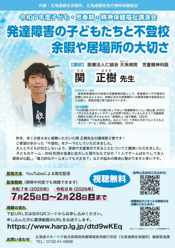 北海道オホーツク総合振興局は、「令和7年度子ども・思春期・精神保健福祉講演会」の講演動画をYouTubeによる限定配信で配信しています。配信期間は、令和8年2月28日(土)までです。