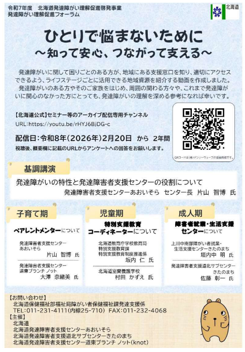 北海道では、令和7年度北海道発達障がい理解促進啓発事業における発達障がい理解促進フォーラムとして、「ひとりで悩まないために~知って安心、つながって支える~」をテーマに、発達障がいに関して困りごとがある方が、地域にある支援窓口を知り、適切にアクセスできるよう、ライフステージごとに活用できる制度などについて紹介する動画を配信中です。