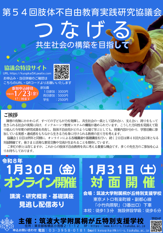 筑波大学附属桐が丘特別支援学校では、「つなげる 共生社会の構築を目指して」をテーマに、肢体不自由教育実践研究協議会を令和8年1月30日(金)・31日(土)の2日間開催します。なお、1日目はオンライン開催、2日目は対面開催となっています。