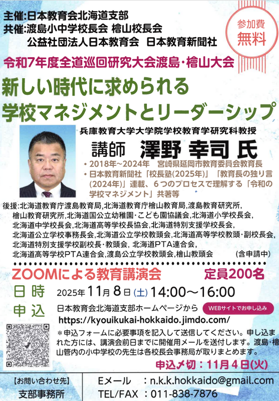 日本教育会北海道支部は、「令和7年度日本教育会北海道支部 全道巡回研究大会渡島・檜山大会 教育講演会」を令和7年11月8日(土)に、Zoomによるオンライン形式で開催します。参加費は無料ですが、定員が200名となっております。申込締切は11月4日(火)です。