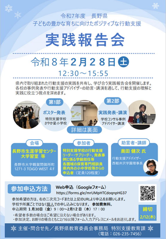 長野県教育委員会では、令和8年2月28日(土)に、令和7年度 長野県子どもの豊かな育ちに向けたポジティブな行動支援実践報告会を開催します。