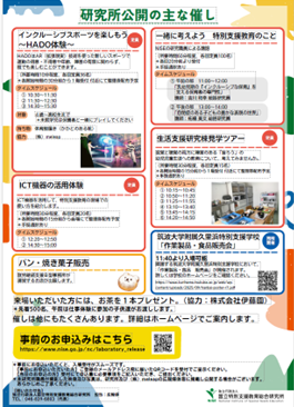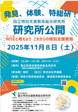 【R7.10.10(金)更新】 国立特別支援教育総合研究所(NISE)では、令和7年11月8日(土)に教育関係者、教育・福祉の道を志す学生や保護者の方々、本研究所に関心をお寄せくださる方々等、幅広い方々に来所いただける「令和7年度研究所公開」を開催します。 研究所公開では、特別支援教育に関する講話やインクルーシブスポーツ体験、ICT機器の活用体験等の催しが行われます。 詳しくは、下記の案内をクリックしてご確認ください。