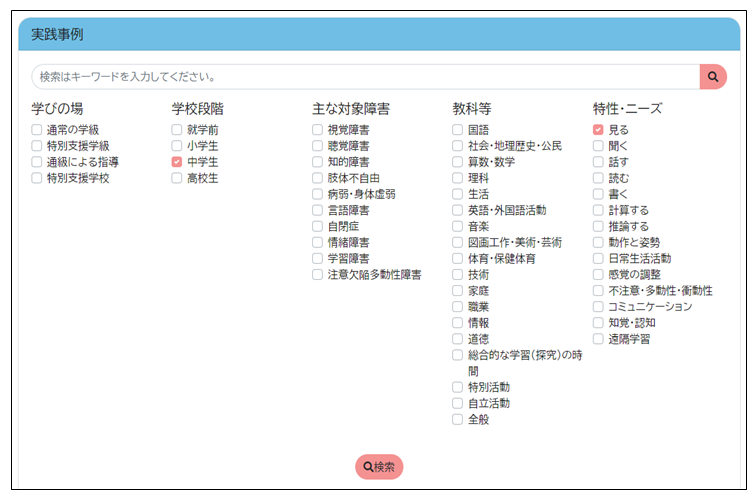 このページでは、全国の小・中学校や特別支援学校における障がいの状態や特性等に応じた教材、支援機器等活用の様々な取組の情報などがデータベース化されており、調べたい内容に応じてキーワードを入力すると、該当する教材・支援機器や実践事例等を検索することができます。 また、詳細検索では、学びの場や学校段階、主な対象障害などにチェックを入れることで、該当する実践事例を検索することができます。