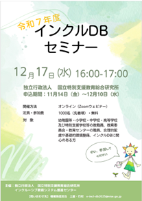 国立特別支援教育総合研究所(NISE)では、「インクルDB(インクルーシブ教育システム構築支援データベース)」の理解を深め、学校や地域での取組や研修などに活用していただくことを目的とした「インクルDBセミナー」を令和7年12月17日(水)にオンラインで開催します。