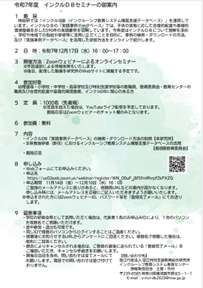 本セミナーでは、インクルDB「実践事例データベース」の検索・ダウンロード方法の説明及び島根県教育委員会による「主幹教諭研修(新任)におけるインクルーシブ教育システム構築支援データベースの活用」についての発表が行われます。